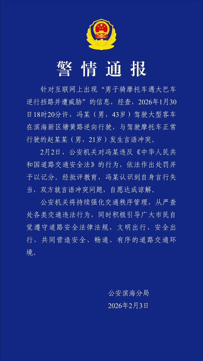 2月3日,天津市公安局滨海分局发布情况通报:针对互联网上出现“男子骑摩托车遇大巴车逆行挡路并遭威胁”的信息,经查,2026年1月30日18时20分许,冯某(男,43岁)驾驶大型客车在滨海新区塘黄路逆向行驶,与驾驶摩托车正常行驶的赵某某(男,21岁)发生言语冲突。